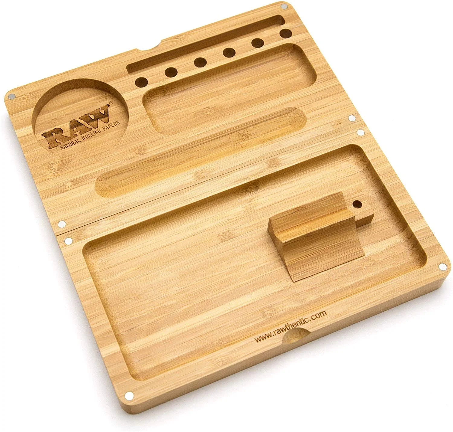 Esta bandeja RAW Bamboo Rolling Tray tiene compartimentos tallados para todos tus accesorios de laminado RAW