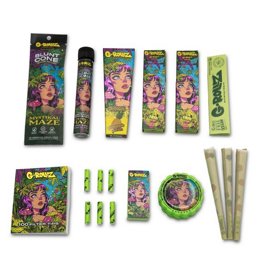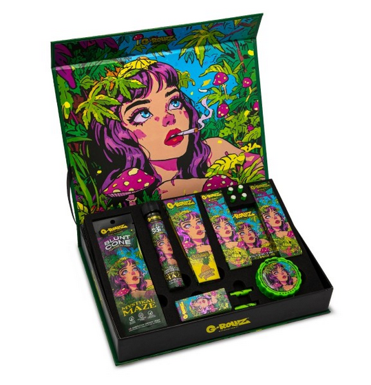 Una caja de regalo de G-Rollz, con papel de laminar, conos, romas, unas puntas y una amoladora.