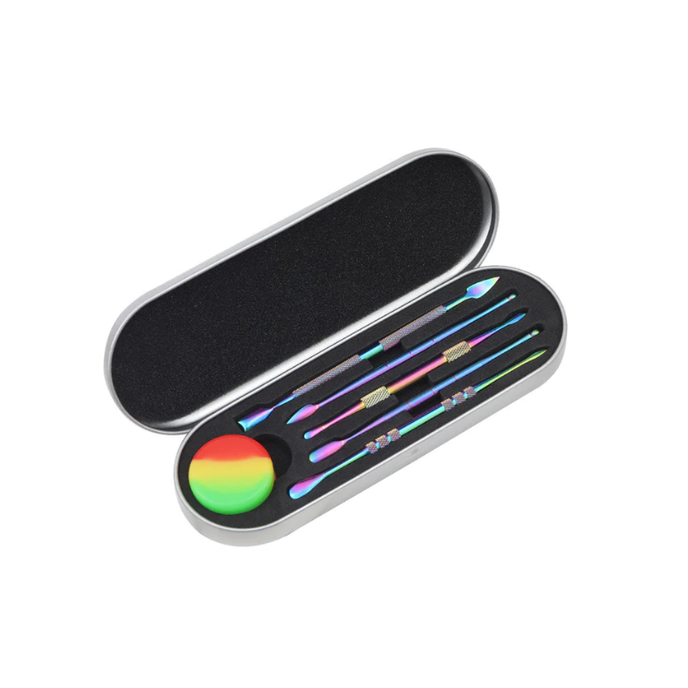 Este set de la marca Poppins Lab incluye seis dabbers metálicos de distintos diseños, con longitudes que oscilan entre los 10,5 y los 12,5 cm, y un bote de silicona multicolor para almacenar concentrados.