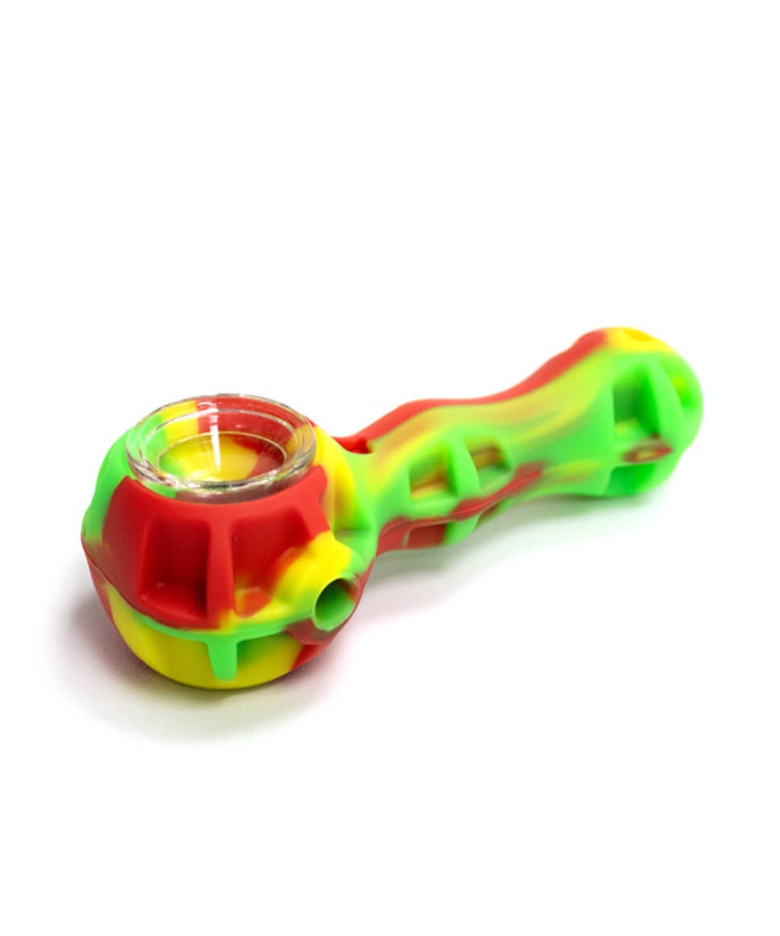 Pipa de silicona con cazuela de cristal y de colores variados. Miden 12 centímetros, fáciles de transportar.